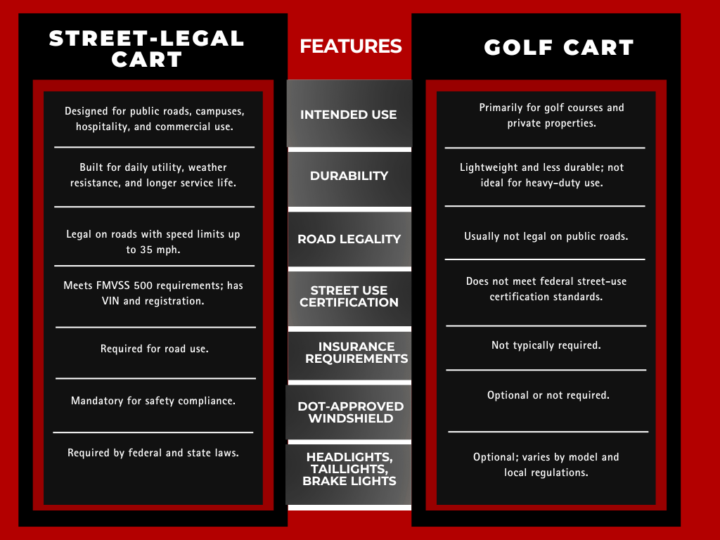 By contrast, a street-legal golf cart—or more accurately, a street-legal LSV—is a fully compliant motor vehicle that offers superior safety and a broader range of uses. In terms of overall capability, it more closely resembles a typical street-legal gas car than a golf cart.
